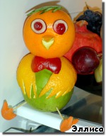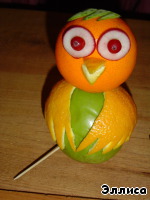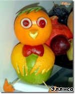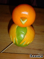 Лапки вырезаем из моркови или кожицы апельсина, крепим их с помощью зубочисток к нижней части яблока.