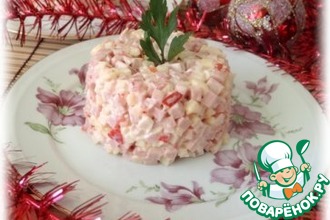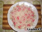 Следующий слой - нарезанные соломкой крабовые палочки.