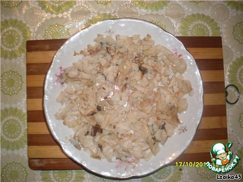 Салат делаем слоями, каждый слой (слегка) смазываем майонезом. Рыбу (у меня был хек) припускаем вместе с солью и специями минут 20. Затем разбираем, выбираем косточки и нарезаем кусочками. Выкладываем на плоское блюдо первым слоем.
