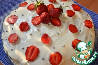 Сливки взбить в густую пену, добавить мелко нарезанные ананасы, пудру, ванилин. Смазать корж, накрыть вторым коржом. -