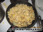 Лук и грибы нарезать и обжарить на растительном масле. Если нет вешенок, можно использовать и шампиньоны.
