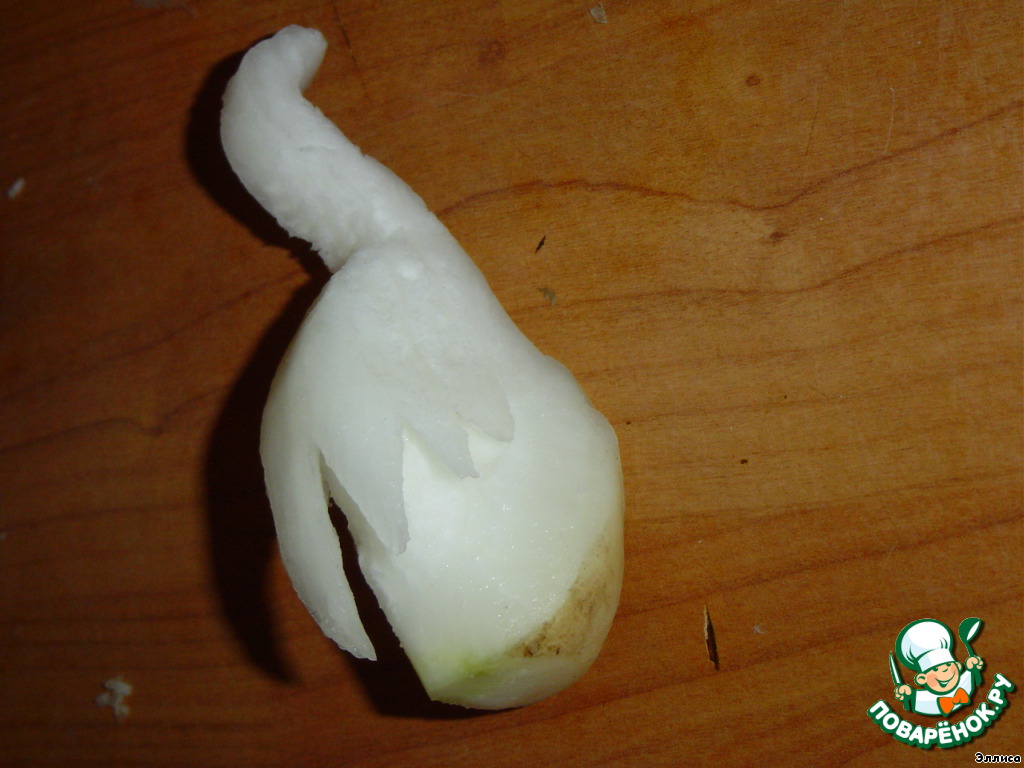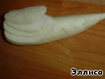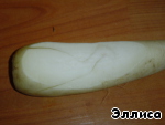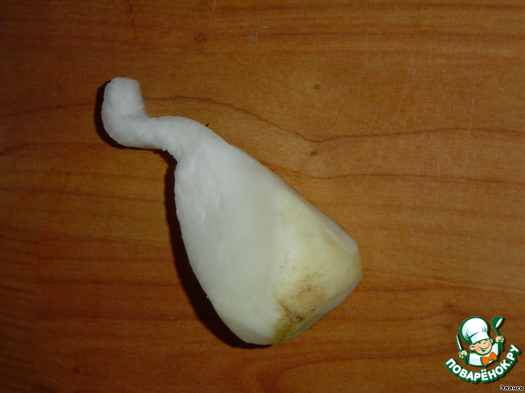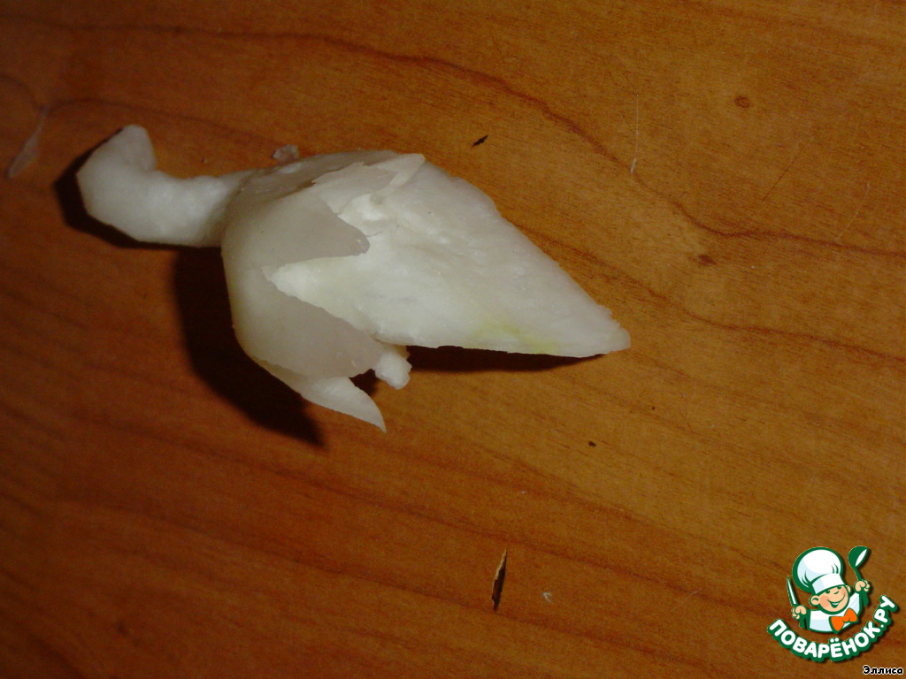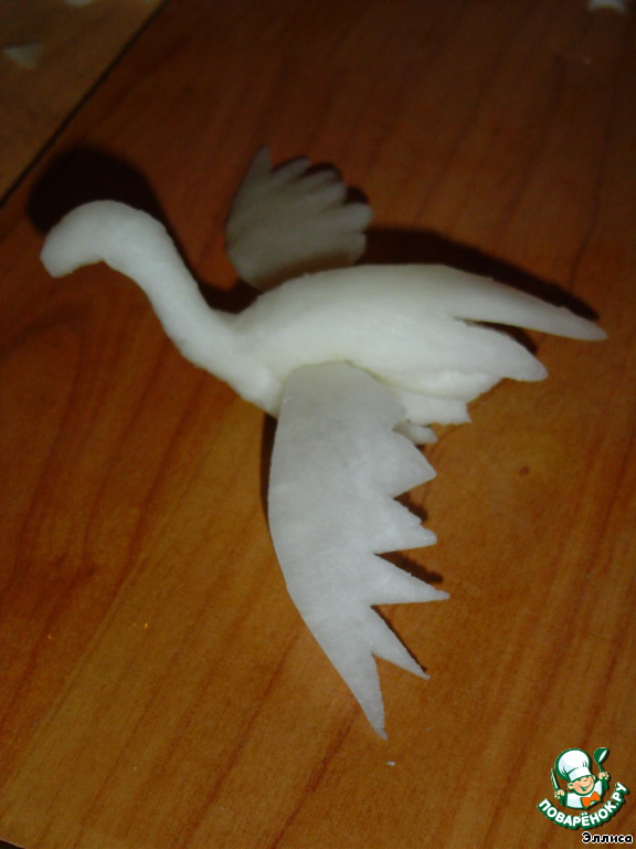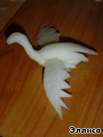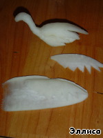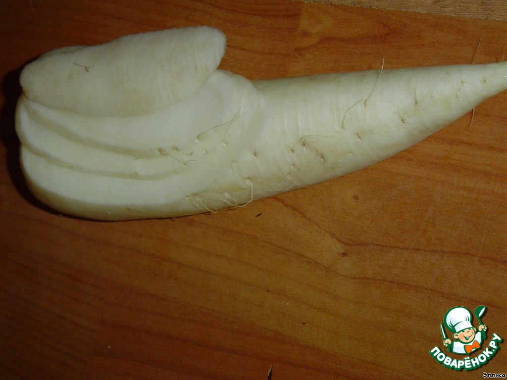 Редьку очищаем и срезаем 2-3 тонкие пластинки - это будущие крылья.