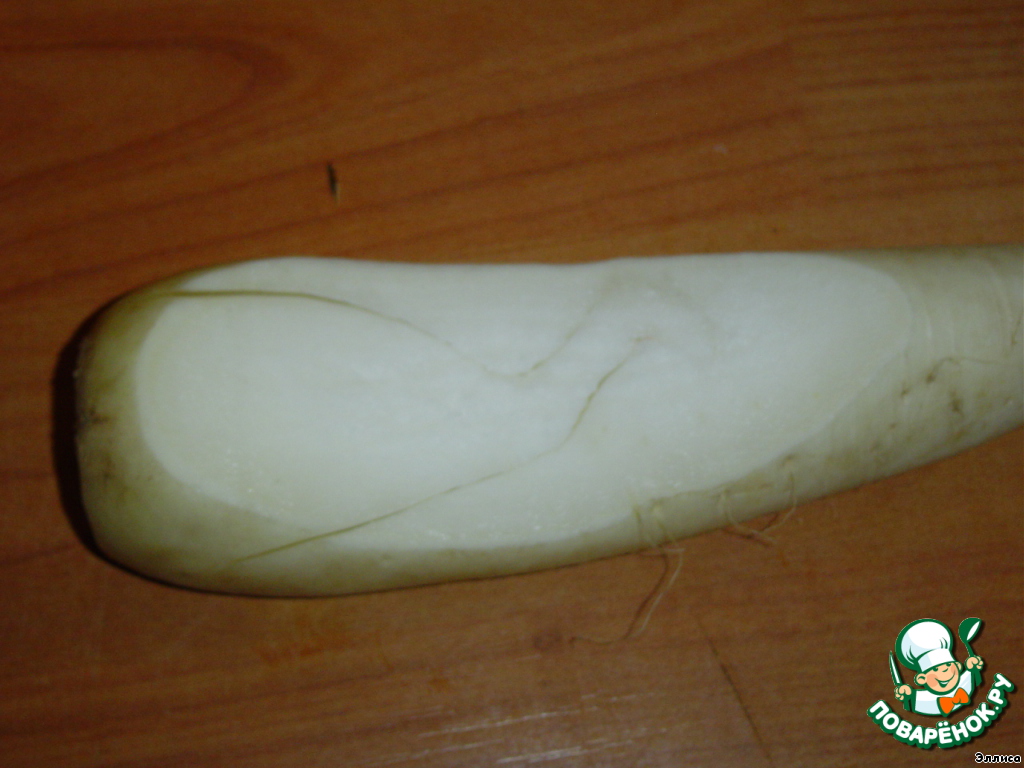 • Редьку очищаем и срезаем 2-3 тонкие пластинки - это будущие крылья.