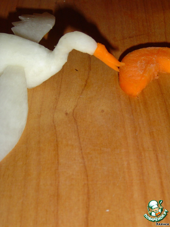• На срезе дайкона намечаем ножом фигурку журавлика