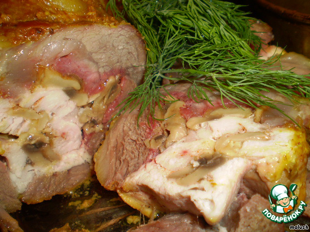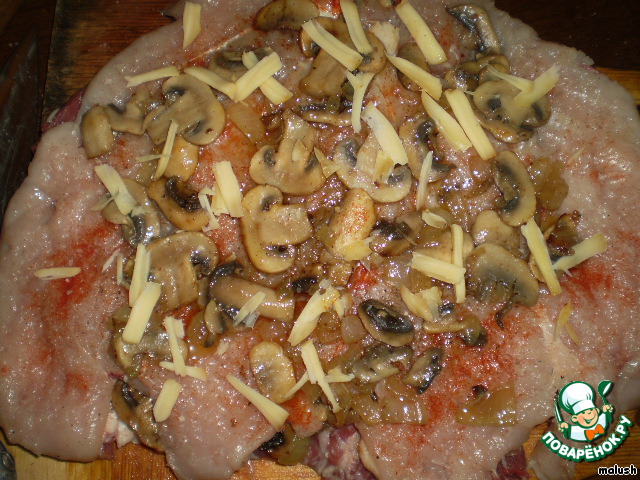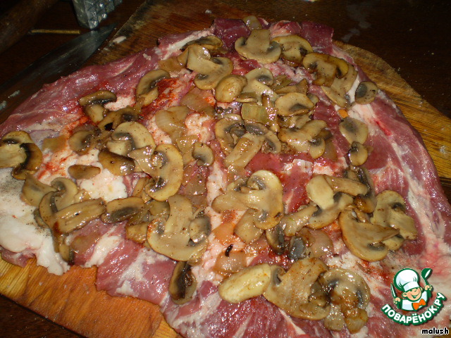 Начнем собирать наш рулетик. Для этого берем промаринованную свинину, кладем пластом и выкладываем часть грибов, равномерно распределив по всей поверхности, кроме краев.