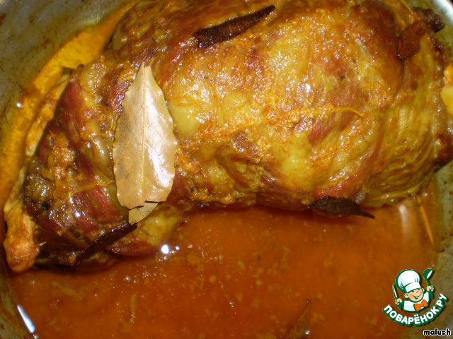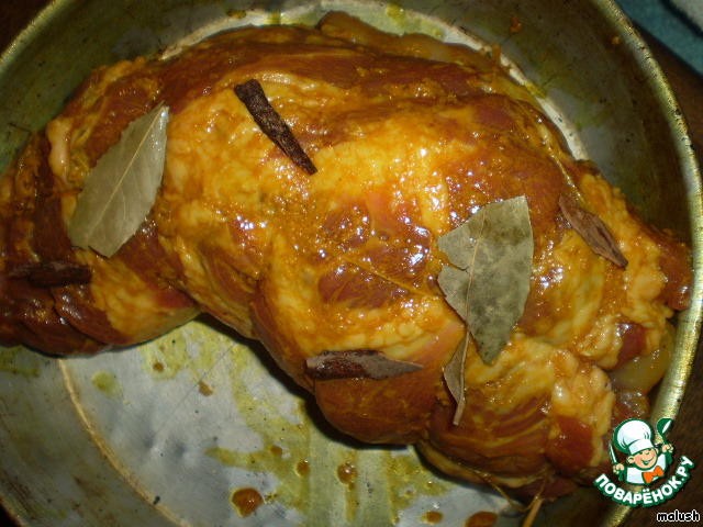 Кладем в форму наш рулетик, сверху на него - лавровый лист и кору корицы. Отправляем в духовку на 2 часа при 150*С.