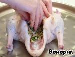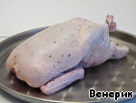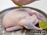 Обсушить утку изнутри и снаружи, сбрызнуть лимонным соком, посолить, поперчить.