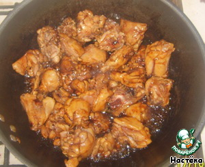 Положить туда 1 ст.л. сахара, как только он потемнеет, отправить в казан курицу и быстро перемешать.