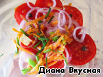 Помидор нарезала кружками и уложила на фольгу, затем лук нарезала кольцами и посыпала остатками от перечной начинки, добавила душистый перец