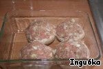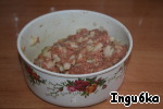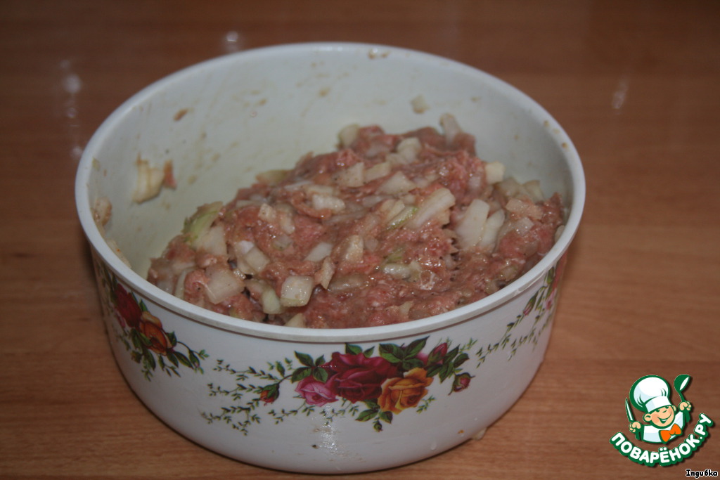 Фарш смешиваем с луком, добавляем соль, перец и яйца. Хорошо все перемешиваем.