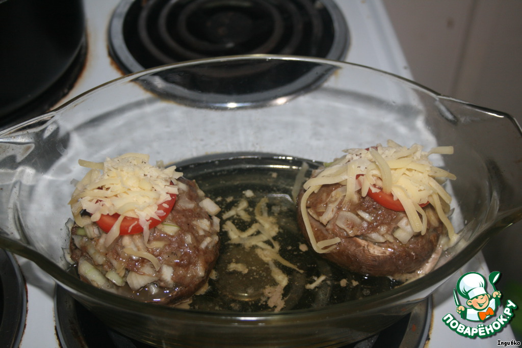 Фаршируем грибы. Ставим в разогретую до 180 градусов в духовку.