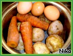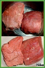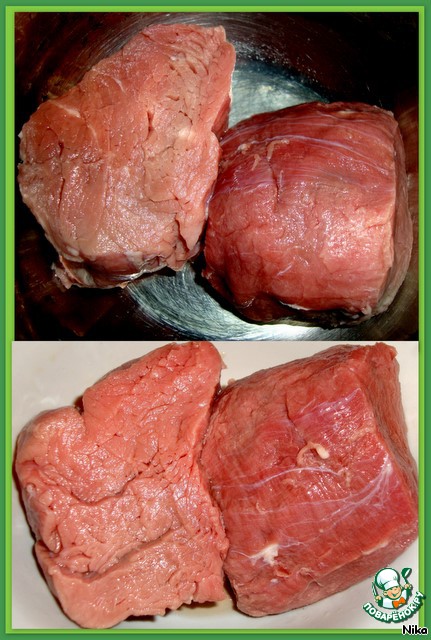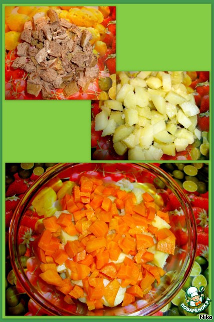 Одну часть мяса (250 г) нарезать и выложить на дно миски. Также нарезать картофель и морковь.