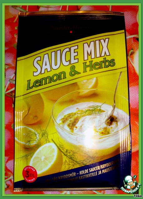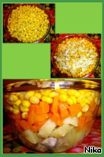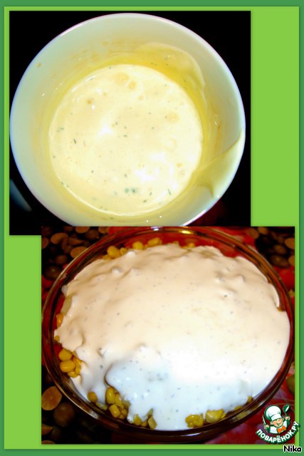Приготовление соуса: 200 г 20%-ной сметаны (можно 10%), 1,5 ч. л. сухого соуса, соль по вкусу. Всё перемешать. Одну часть соуса вылить на кукурузу.