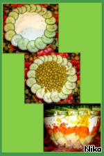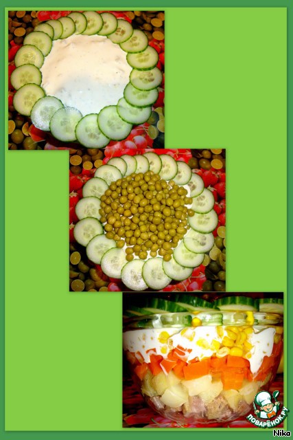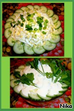 Нарезать огурец кольцами, выложить по краю салата. В середину зелёный горошек.