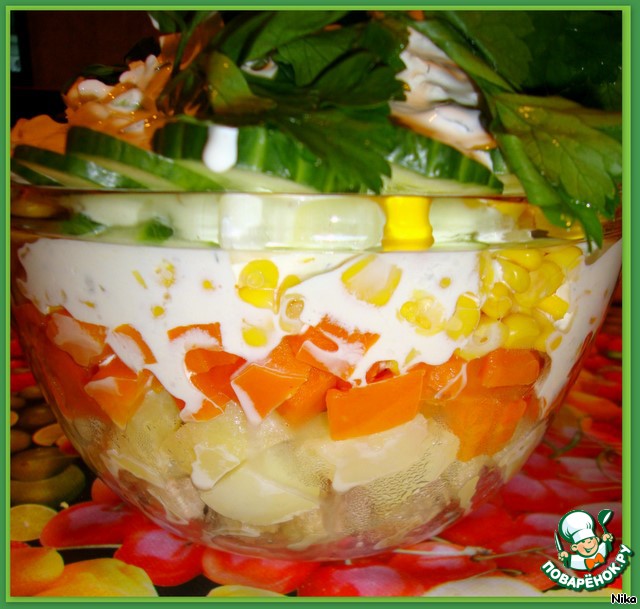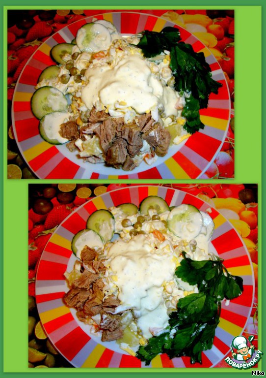 Салат из овощей, которые всегда есть в моeм холодильнике. Очень люблю салаты, где имеются зелeный горошек и кукуруза одновременно. В этот салат я добавила отварное мясо телятины.