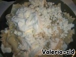 В сковороду с жиром от сала выкладываем макароны. Немного прогреваем. Добавляем творог и сметану.