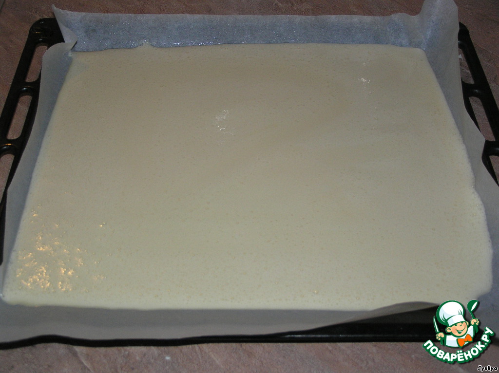 • Противень застелить бумагой. Вылить тесто. Поставить в горячую духовку.