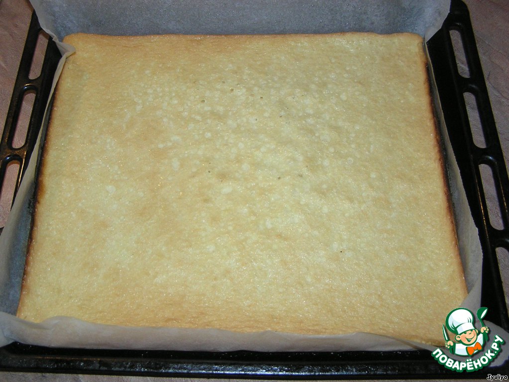 • Через 10-15 минут готов наш бисквит. Дать ему остыть. А в это время сделать заварной крем: мука 1 ст. л.+сахар+молоко варить до густоты, остудить. Добавить сливочное масло, тщательно перемешать.