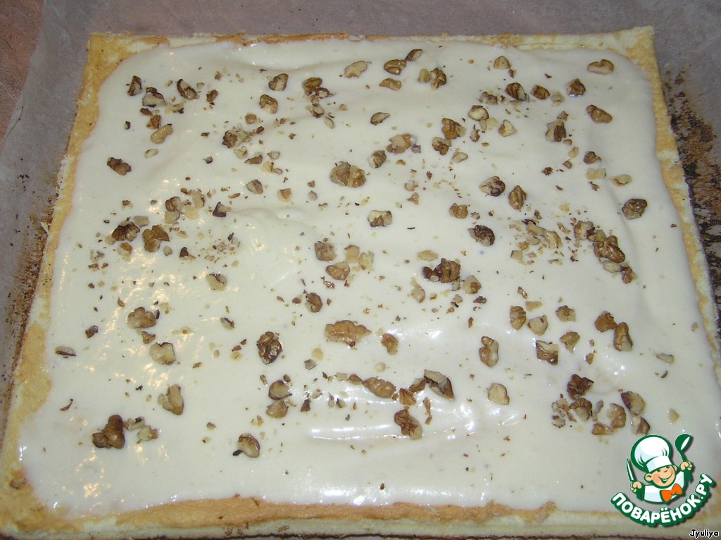 • Намазать остывший корж кремом, посыпать орехами.