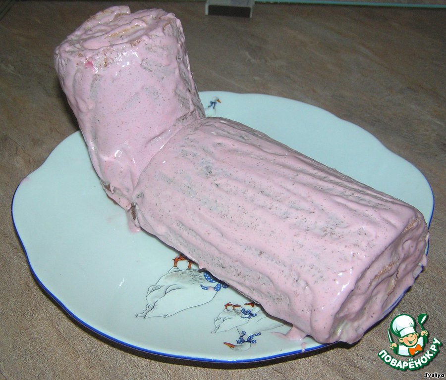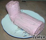 • Свернуть рулет. Свершилось чудо! Рулет, как и обещали хорошо свернулся и не лопнул! Разрезать на две части. Сделать глазурь: белок яйца взбить с сахаром в крепкую пену. Для цвета я добавила сок свеклы. Намазать половинки рулета.