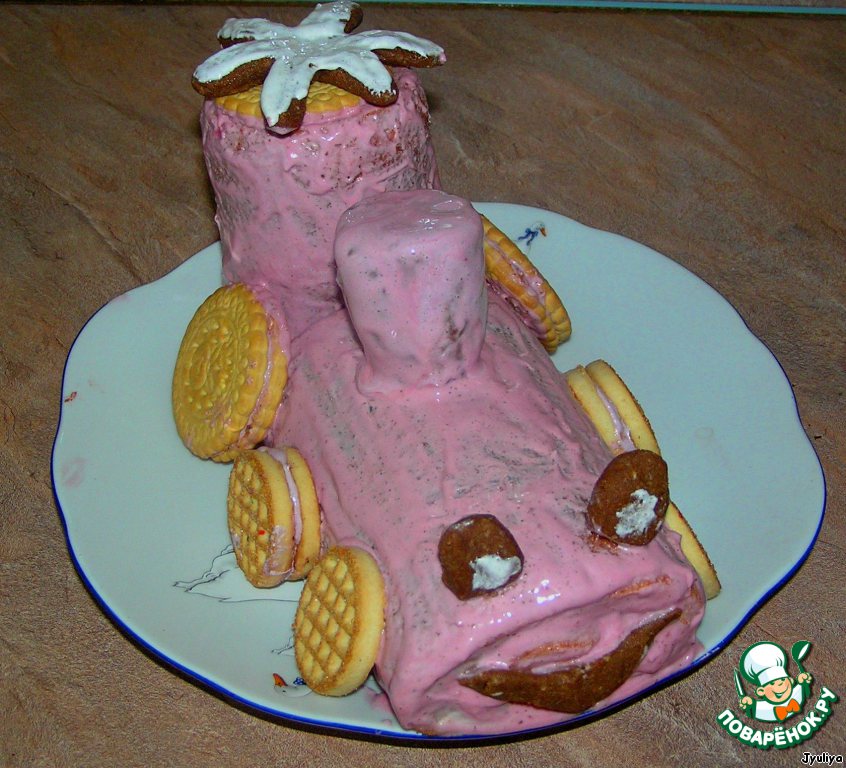 • Трубу, глазки, ротик и ромашку я сделала из молотого печенья+сахар+масло сливочное (смесь как для пирожного "картошка"). Колеса из печенья разного диаметра.