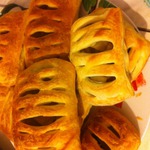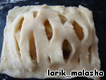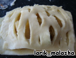 Раскатать тесто в тонкий пласт. Отрезать прямоугольник теста и сделать "жалюзи" - ножом сделать одну длинную насечку и 2 короткие, одну длинную, 2 короткие и так далее.