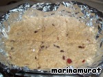 ... разделить ножом на квадраты и поставить в разогретую до 160 градусов духовку на 40 минут, затем еще 10 минут при 200 гр. для корочки. Время запекания зависит от толщины слоя - чем тоньше, тем быстрее.