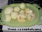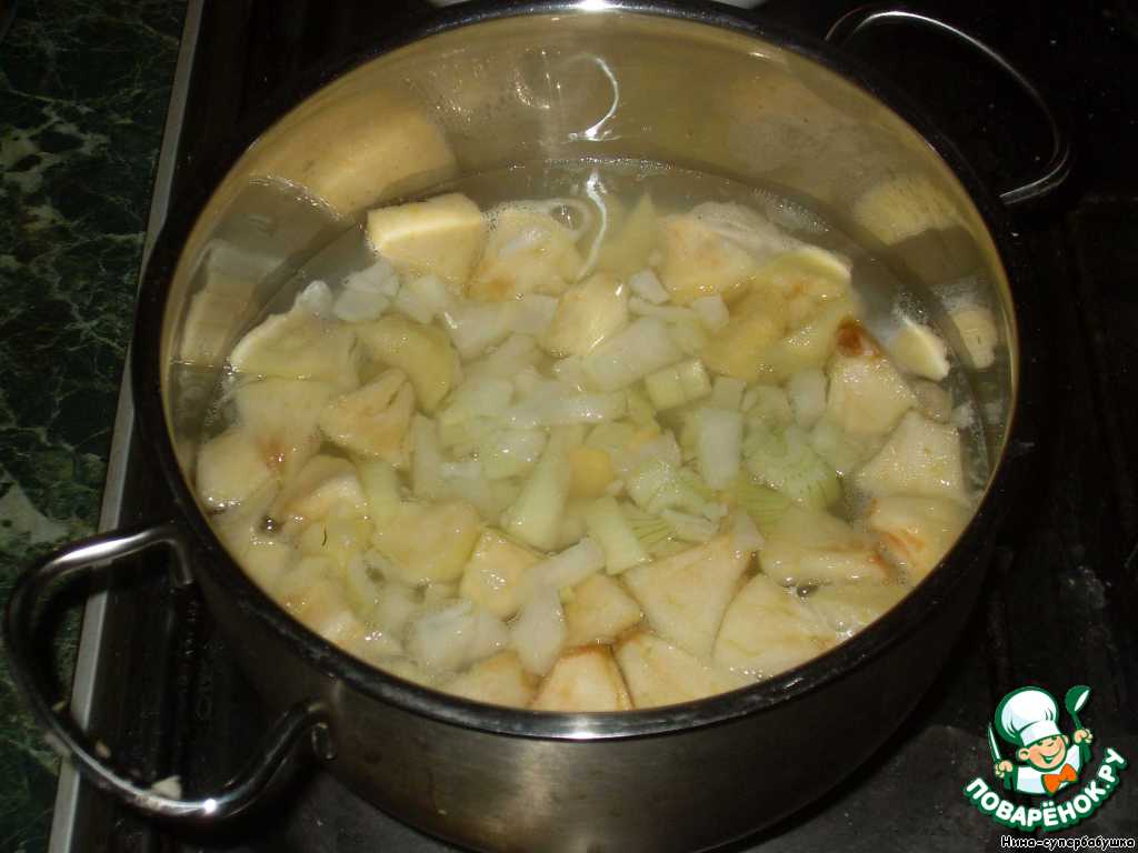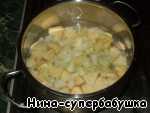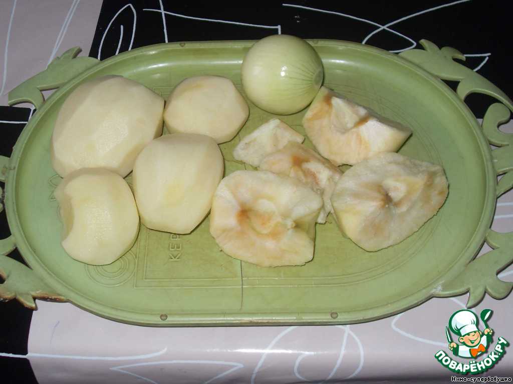 Картофель, лук и яблоко очистить и нарезать небольшими кусочками.