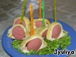 Закуску нарезать на небольшие кусочки, вставить разноцветные вилочки и подавать к столу!!! Приятного аппетита!