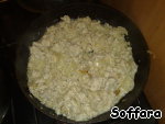 Ставим сковорду, немного наливаем растительного масла и кладем туда сначала айву, а через 3 минутки лук. Пассируем. -