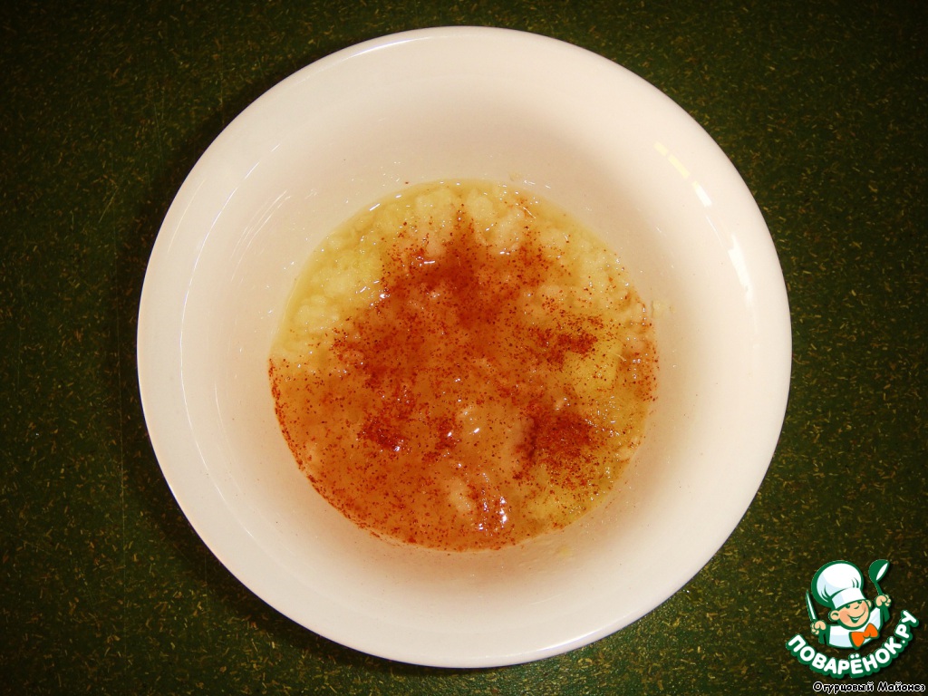 Готовим первый соус: выжатый лимонный сок (с мякотью) смешиваем с чесноком и кайенским перцем.
