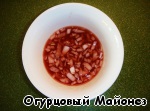 Готовим второй соус: мелко рубим репчатый лук и заливаем его винным уксусом. Оба соуса накрываем плёнкой и оставляем на некоторое время при комнатной температуре, чтобы лук и чеснок немного промариновались уксусом и соком лимона.