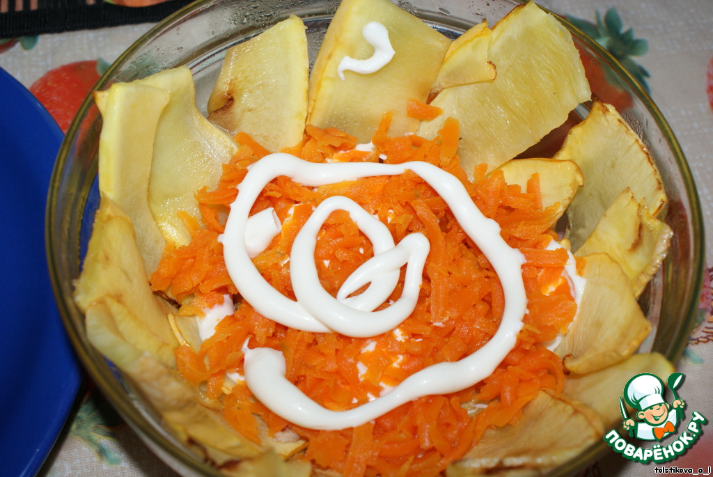 Далее кладем натертую на терке одну вареную морковь, смазываем майонезом