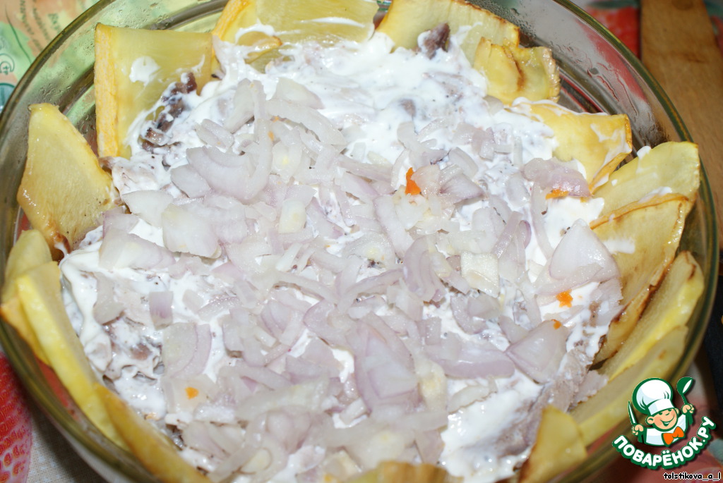 На морковь выкладываем отварное нарезанное мясо (прошу прощения, забегалась и не сделала фото этого шага), солим, смазываем майонезом, кладем нарезанный репчатый лук