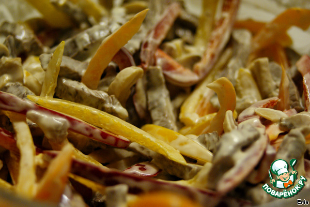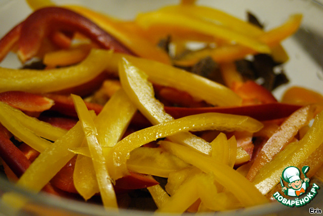 Такими же полосками режем перцы. Смешиваем с мясом.