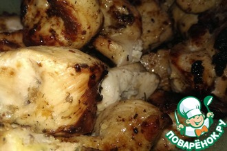 Филе порезала крупными кубиками, грибы - пластинками. Приготовила маринад и замариновала на ночь.