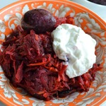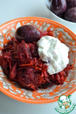 Охлажденные овощи заправить йогуртом. Сахар не требуется, т.к. и свекла, и морковь, и йогурт сладкие. Но сладкоежки могут добавить совсем чуть-чуть сахара. По желанию можно добавить лимонный сок и цедру.
