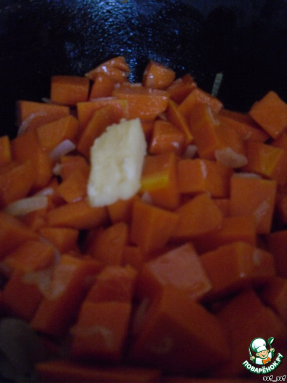 Обжариваем в растительном масле 4-5 минут, затем доливаем 0,5 стакана воды, накрываем крышкой и оставляем тушиться до мягкости на маленьком огне (около получаса). Когда тыква приготовится, то добавляем 1 ст.л. сливочного масла .