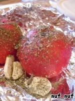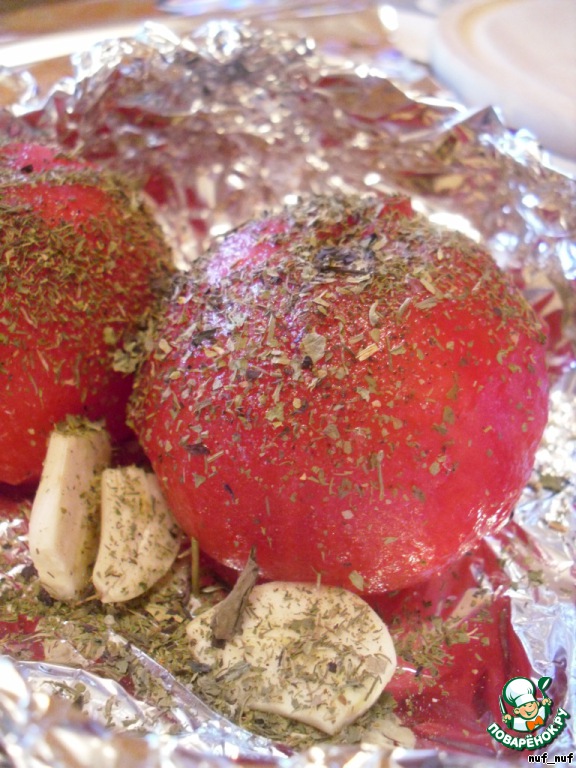 Через 3-4 минуты вылавливаем помидоры и, обдав холодной водой, снимаем кожицу. Солим, перчим, посыпаем их головы прованскими травами. Присоседиваем к ним 3-4 зубчика чеснока и заворачиваем в двойной лист фольги. Запекаем в духовке при температуре 180-190 градусов 20-25 минут.