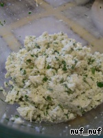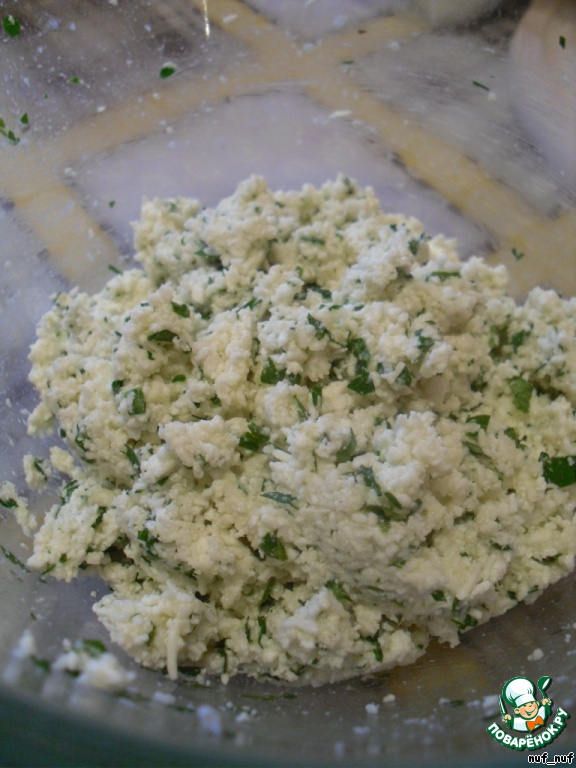 Начинка для равиоли: брынзу натереть на мелкой тёрке, добавить мелко нарубленную зелень петрушки, 2 яичных желтка (белки нам понадобятся при лепке равиоли) и молотый мускатный орех.