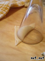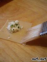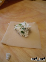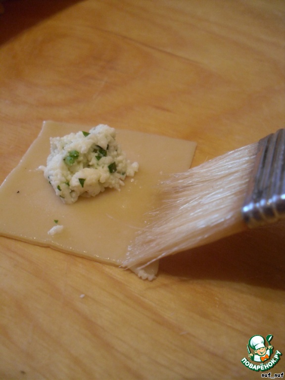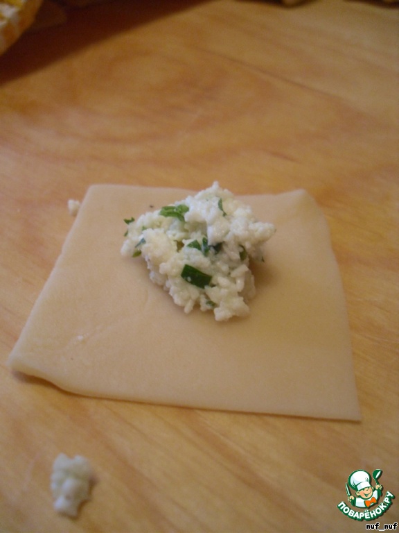 Тесто раскатать тонко, нарезать на квадраты 4х4 см., в серединку каждого квадрата кладём начинку (около половины чайной ложки).