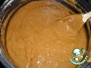 Подмешать оставшуюся половину и подмешать всe к шоколаду. Смешать муку с разрыхлителем и просеять в смесь.
