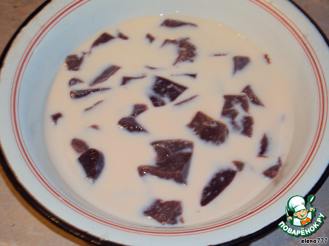 Печень нарезать, хорошо промыть в нескольких водах и залить молоком, пока будут готовится овощи и грибы.