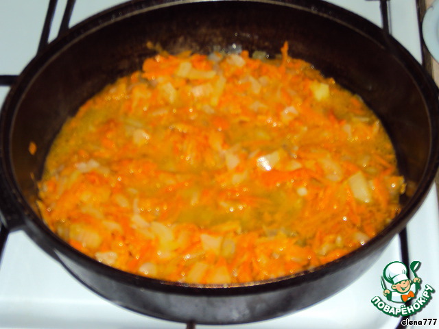 Выложить в сковороду или сотейник тёртую морковь и нарезанный лук,