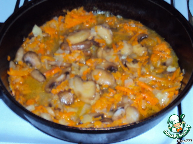 Затем добавить к овощам нарезанные шампиньоны (я взяла замороженные), посолить, поперчить и тушить до мягкости грибов.
