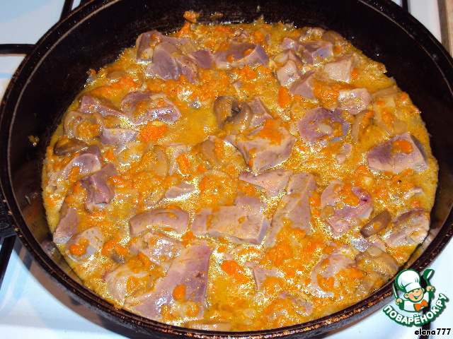 С печени слить молоко, выложить её в сковороду с грибами и овощами и тушить 5-6 минут. Можно ещё немного посолить и поперчить.