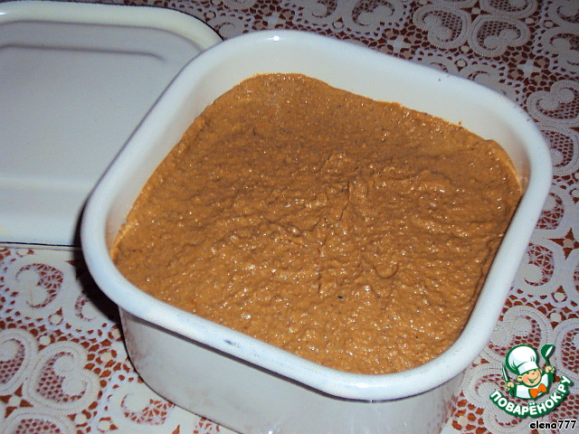 К измельчённой массе добавить 100 г размягчённого сливочного масла, хорошо перемешать, выложить паштет в керамическую или эмалированную ёмкость, накрыть крышкой и поставить в холодильник для полного остывания.