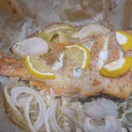 Морской окунь, запеченный в сметанном соусе с лучком, зеленью и тонкой масляной ноткой... ммммм... очень вкусная рыбка получается)))