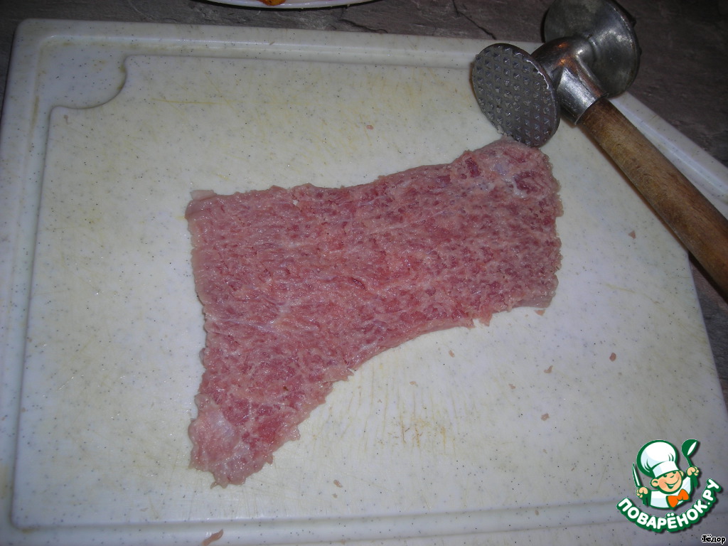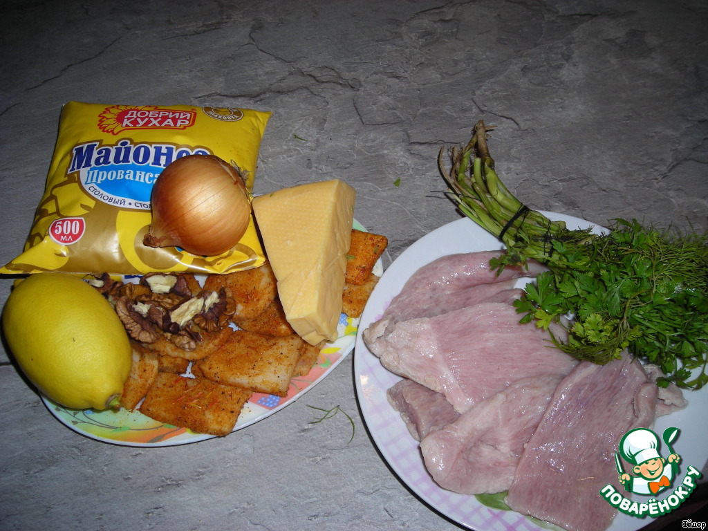 Положить на край мяса кусочек сала, полудольку лука и кусочек твёрдого сыра. Свободное мясо смазать майонезом (можно немного аджики, кто любит острое).