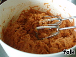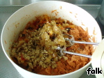 Замесить тесто из моркови, муки, яиц, разрыхрителя, оливкового масла.